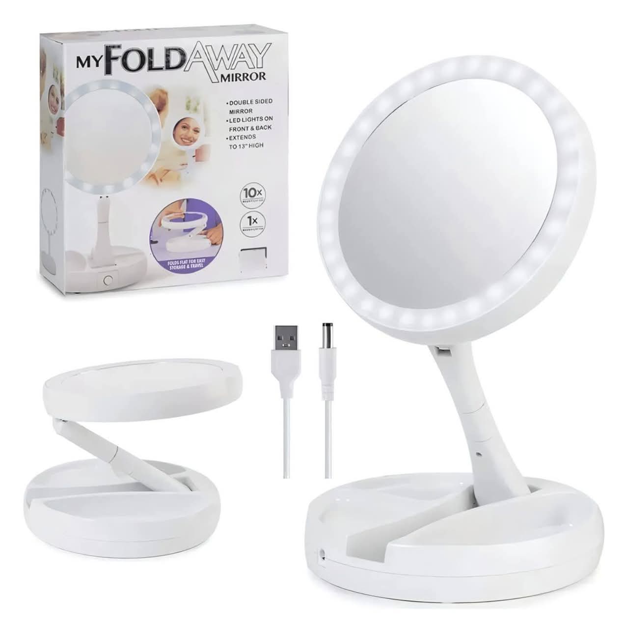 Viene en caja, incluye cable usb para recarga también se puede utilizar con pilas, se agranda y achica, tiene 2 modelos de espejo normal y con aumento,