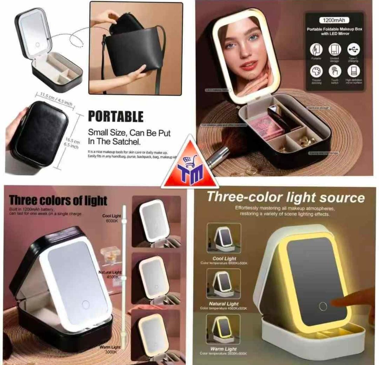Viene en caja, es ideal para regalar y tener en cartera. incluye cable usb para recargar el espejo led.